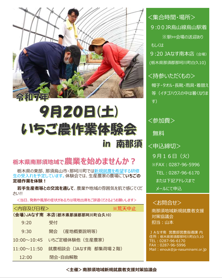 ※農業体験会スケジュール(いちご)の第2回 定植体験及び相談会日程が9月14日(日)となっていますが、正しくは9月20日(土)になります。