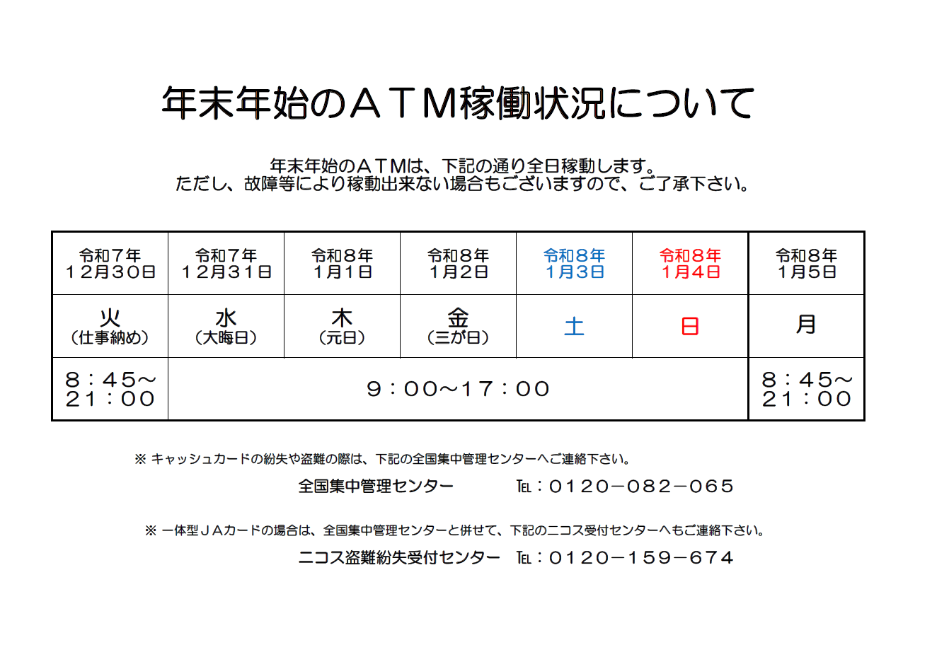 年末年始のATM稼働状況について